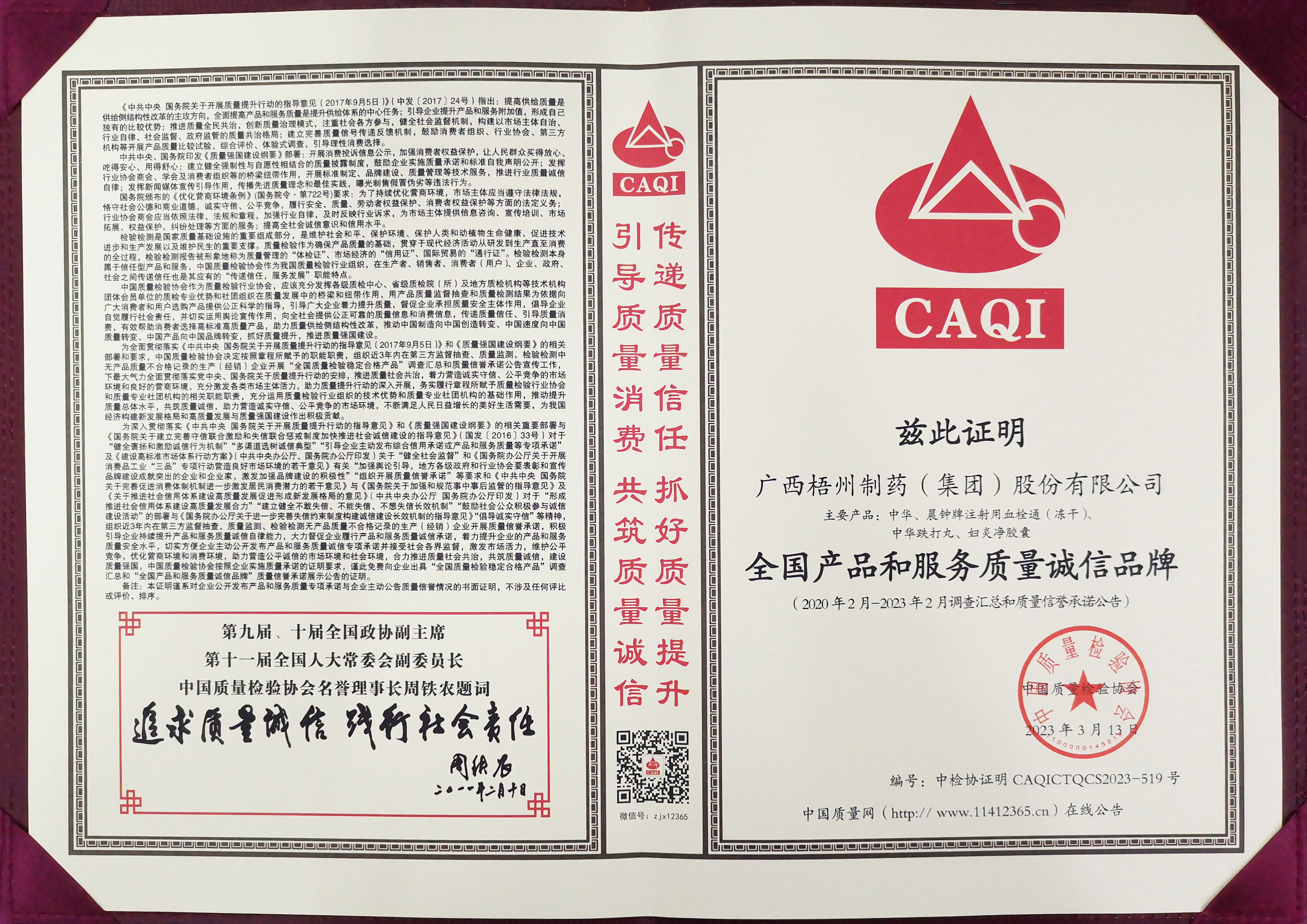 廣西梧州制藥(集團(tuán))股份有限公司榮獲2023年全國產(chǎn)品和服務(wù)質(zhì)量誠信品牌