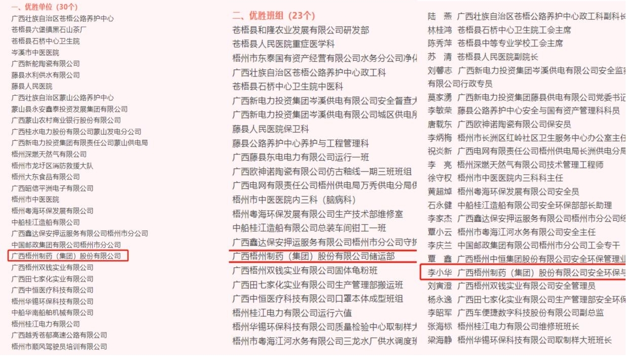 近日,梧州市“安康杯”競(jìng)賽組委會(huì)辦公室通報(bào)2022年度梧州市“安康杯”競(jìng)賽活動(dòng)先進(jìn)集體和優(yōu)秀個(gè)人,梧州制藥榮獲先進(jìn)集體榮譽(yù)稱(chēng)號(hào),公司儲(chǔ)運(yùn)部榮獲優(yōu)勝班組,原料藥車(chē)間安全環(huán)保與設(shè)備主管李小華榮獲優(yōu)秀個(gè)人稱(chēng)號(hào)。