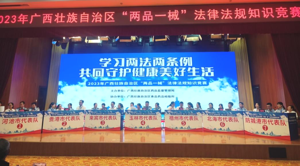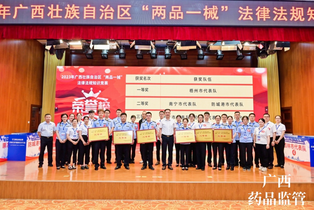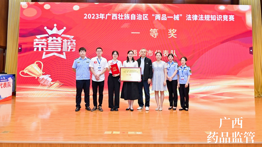 7月13日,由梧州制藥員工代表——質量控制部呂金慧、質量保證部李佳霖與梧州市場監(jiān)督管理局監(jiān)管人員組成的梧州市代表隊參加廣西壯族自治區(qū)“兩品一械”法律法規(guī)知識競賽,憑借過硬的專業(yè)知識、迅速的反應能力、高效的團隊配合力,與全區(qū)14個市代表隊展開激烈角逐,榮獲得2023年廣西壯族自治區(qū)“兩品一械”法律法規(guī)知識競賽一等獎。
