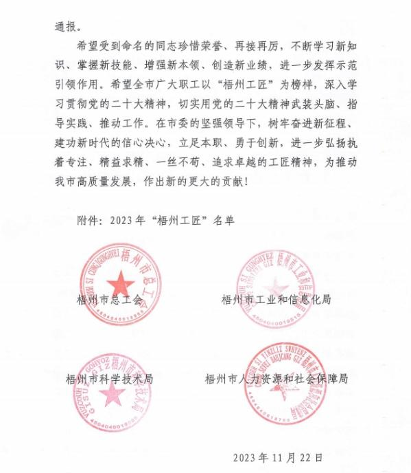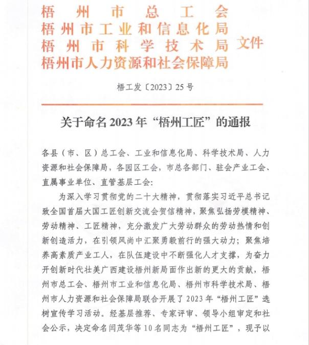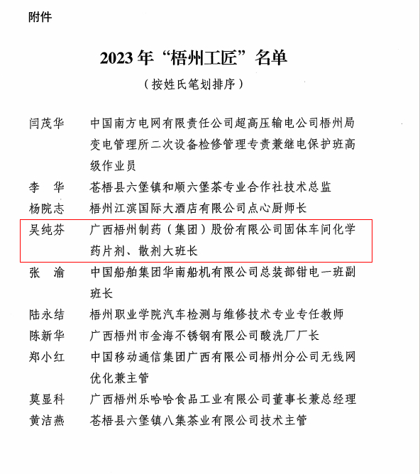 近日,梧州市總工會、梧州市工業(yè)和信息化局、梧州市科學技術局、梧州市人力資源和社會保障局聯(lián)合發(fā)布《關于命名2023年“梧州工匠”的通報》,梧州市有10名同志被選樹為“梧州工匠”,其中,梧州制藥固體車間化吳純芬獲此殊榮。