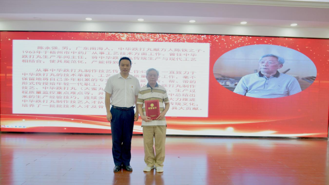 活動(dòng)還專門邀請了中華跌打丸獻(xiàn)方人陳鐵的兒子,現(xiàn)已83歲高齡的原跌打丸生產(chǎn)車間主任陳永強(qiáng)到會(huì),由公司黨委書記、董事長黃文彩為其頒發(fā)“中華跌打丸制作技藝——金牌師父”榮譽(yù)稱號(hào)。“中華跌打丸制作技藝”的第三、第四、第五代非遺傳承人依次上臺(tái),同樣用傳統(tǒng)的束脩六禮對(duì)陳老進(jìn)行了謝師,以此來表達(dá)對(duì)師父的感激之情、教導(dǎo)之恩。