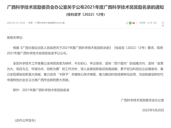 近日,廣西科學(xué)技術(shù)獎(jiǎng)勵(lì)委員會(huì)辦公室發(fā)布《關(guān)于公布2021年度廣西科學(xué)技術(shù)獎(jiǎng)獎(jiǎng)勵(lì)名錄的通知》(桂科獎(jiǎng)字〔2022〕12號),2021年度廣西科學(xué)技術(shù)獎(jiǎng)揭曉,162項(xiàng)科技成果榜上有名,其中梧州制藥與天津中醫(yī)藥大學(xué)、浙江大