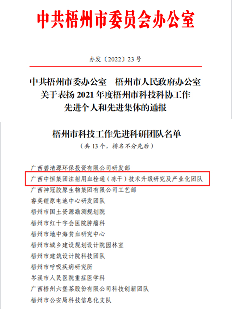 近日,中共梧州市委辦公室、梧州市人民政府辦公室發(fā)布《關(guān)于表揚(yáng) 2021年度梧州市科技科協(xié)工作先進(jìn)個(gè)人和先進(jìn)集體的通報(bào)》,“注射用血栓通(凍干)技術(shù)升級研究及產(chǎn)業(yè)化團(tuán)隊(duì)”榮獲“梧州市科技工作先進(jìn)科研團(tuán)隊(duì)”稱號。