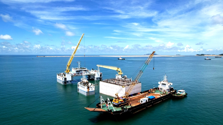 據(jù)了解,本工程12件沉箱均從博賀沉箱預(yù)制場出運,距茂名港博賀新港區(qū)東區(qū)油品碼頭E2泊位水路約10海里。沉箱在預(yù)制場上駁后,需在1.7m以上潮位,由功率4000HP的拖輪將半潛駁拖經(jīng)底標(biāo)高為-3.8m的出運航道、漁港航道,繞過蓮頭嶺南側(cè)淺灘,至碼頭現(xiàn)場后,半潛駁利用GPS定位系統(tǒng)拋錨定位到碼頭前沿下潛坑下潛,沉箱浮游出駁,最后由方駁定位安裝。沉箱在安裝完成后,還會繼續(xù)往里面填料,再進(jìn)行沉箱的混凝土接高,封倉,胸墻施工等工序,全部完成后就可作為重型構(gòu)筑物的堅實的基礎(chǔ)了。