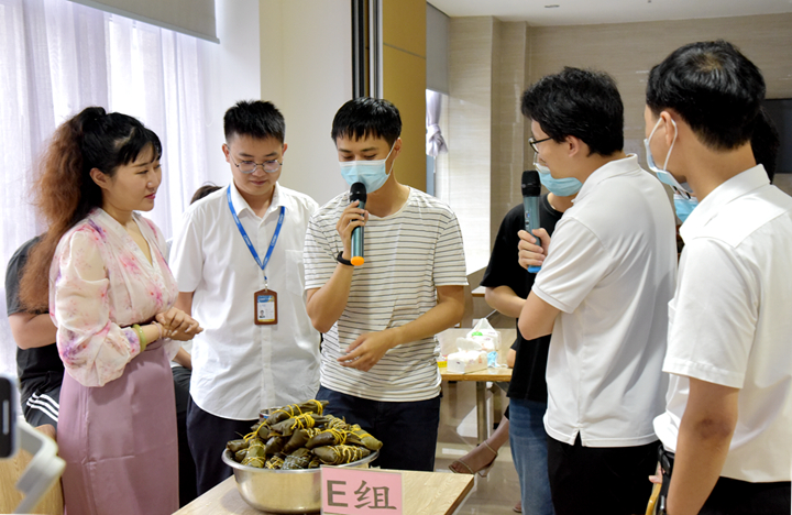 包粽子比賽通過人員交叉搭配進(jìn)行分組比賽。在嫻熟的“老手”作現(xiàn)場示范講解后,各組隊(duì)員紛紛動(dòng)手上陣。只見組員之間分工合作、相互配合,折粽葉、裝糯米、放餡料、裹扎繩……大家紛紛拿出自己的“拿手絕活”。30分鐘的比賽里洋溢著歡聲笑語,各位選手巧手翻飛,一個(gè)個(gè)形態(tài)各異的粽子瞬間成型。最后,大會(huì)裁判以“速度、質(zhì)量、美觀、衛(wèi)生”為評判標(biāo)準(zhǔn)對各組粽子進(jìn)行了評選。