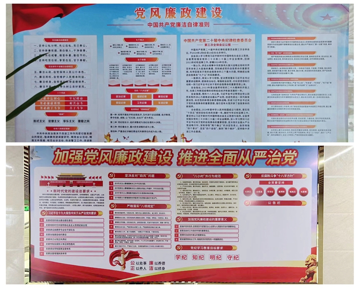 集團(tuán)各黨支部緊密結(jié)合自身實(shí)際條件,有效利用大廳、走廊、樓道等空間資源,認(rèn)真宣貫好黨的路線方針政策,靈活打造了具有本支部鮮明主題特色的廉潔文化宣傳陣地,將廉潔思想、廉潔紀(jì)律、廉潔文化融入了企業(yè)生產(chǎn)經(jīng)營全過程,營造了風(fēng)清氣正干事創(chuàng)業(yè)的濃厚氛圍。2024年上半年以“學(xué)習(xí)貫徹二十屆中央紀(jì)委三次全會(huì)精神”為主題在集團(tuán)各黨支部廉潔文化陣地開展了首次宣貫。