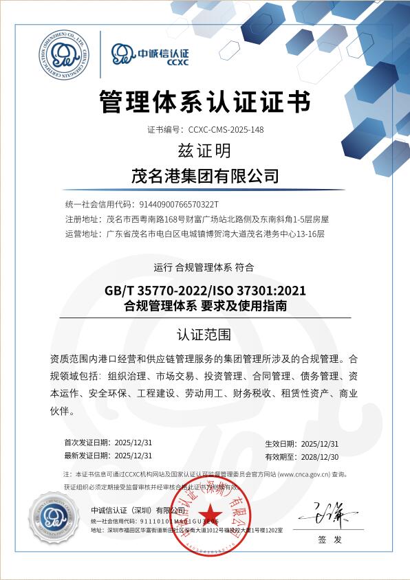 近日,茂名港集團(tuán)有限公司成功通過權(quán)威認(rèn)證機(jī)構(gòu)審核,榮獲ISO 37301:2021合規(guī)管理體系國際標(biāo)準(zhǔn)認(rèn)證與GB/T 35770-2022合規(guī)管理體系國內(nèi)標(biāo)準(zhǔn)認(rèn)證。這標(biāo)志著茂名港集團(tuán)在合規(guī)管理體系建設(shè)方面達(dá)到了國際國內(nèi)先進(jìn)水平,成為茂名市首家獲得合規(guī)管理體系認(rèn)證的市屬國有企業(yè),在企業(yè)治理現(xiàn)代化與規(guī)范化道路上邁出了具有里程碑意義的關(guān)鍵一步。