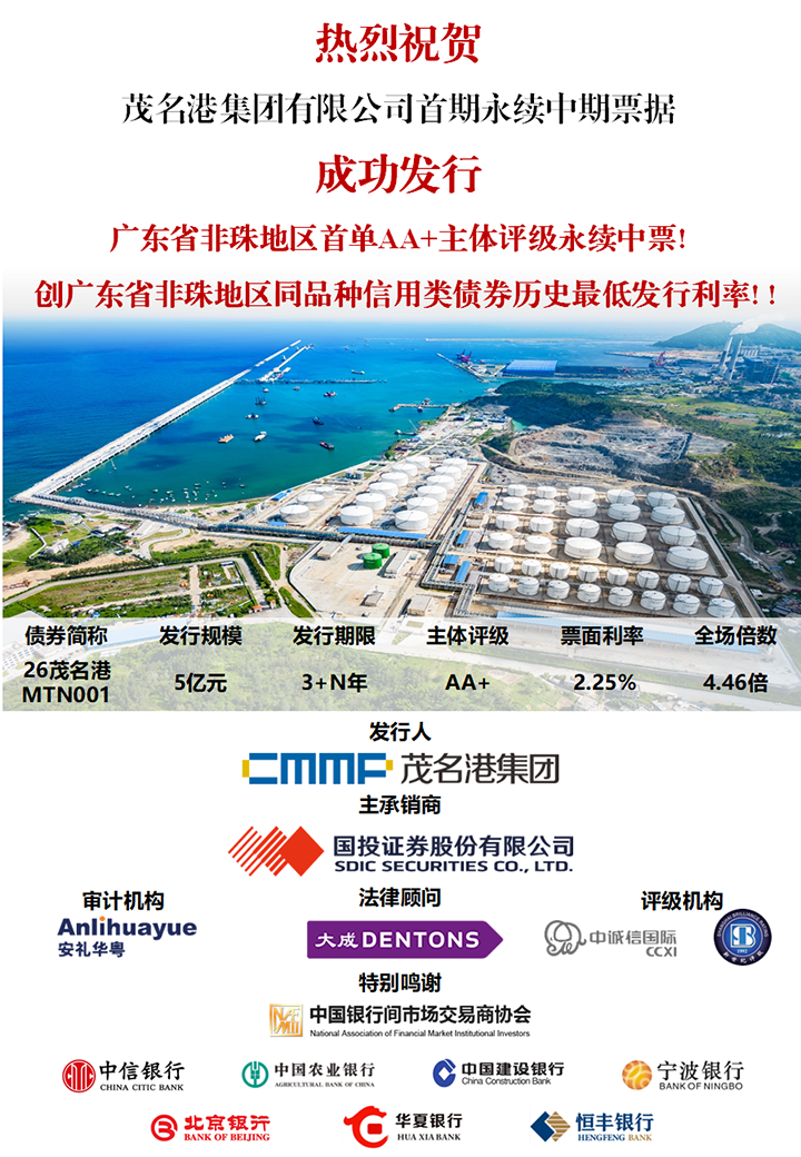 2月4日,正值立春,萬(wàn)物始新。茂名港集團(tuán)在這一天成功簿記發(fā)行5億元永續(xù)中期票據(jù),以生機(jī)盎然之勢(shì)為集團(tuán)發(fā)展注入新的蓬勃?jiǎng)恿。本次債券期限?+N年,發(fā)行成果尤為亮眼——票面利率2.25%,全場(chǎng)認(rèn)購(gòu)倍數(shù)高達(dá)4.46倍,票面利率為茂名地區(qū)全品種債券發(fā)行最低紀(jì)錄,亦創(chuàng)下廣東省非珠地區(qū)同品種信用類債券歷史新低。